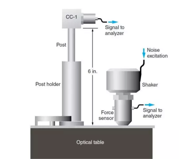 光學(xué)元件的形變是系統(tǒng)不穩(wěn)定的第二大來(lái)源。即使將光學(xué)平臺(tái)視作剛體,該剛體的固有振動(dòng)依然會(huì)觸發(fā)光學(xué)調(diào)整架的自然振動(dòng),導(dǎo)致光路不穩(wěn)定。為了定量模擬光學(xué)調(diào)整架在典型實(shí)驗(yàn)室環(huán)境中可能產(chǎn)生的位移,我們將1英寸調(diào)整架固定于6英寸鏡柱上,并在光學(xué)平臺(tái)表面模擬類(lèi)似于桌面上的風(fēng)扇、電動(dòng)位移臺(tái)或其他聲學(xué)擾動(dòng)的寬帶噪聲。調(diào)整架的位移由一個(gè)不產(chǎn)生任何質(zhì)量效應(yīng)的激光測(cè)振儀來(lái)測(cè)量。實(shí)驗(yàn)使用了主動(dòng)阻尼光學(xué)平臺(tái),同時(shí)測(cè)量結(jié)構(gòu)阻尼和主動(dòng)阻尼的運(yùn)動(dòng),以便充分地體現(xiàn)阻尼桌面的減振效果。