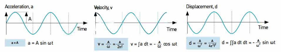振動一般可通過位移、 速度和加速度來表示,此時振動的形狀和周期無論用位移、 速度、 加速度中任何一個來表示均是相同的,但差異在千存在位相差。 就正弦波信號而言,位移、 速度及加速度增幅與時間函數(shù)有著數(shù)學上的相關關系。 如不考慮位相,速度則由與頻率成比例的任意常數(shù)除以加速度來計算得出,位移則以與頻率自乘成比例的任意常數(shù)除以加速度來計算得出。